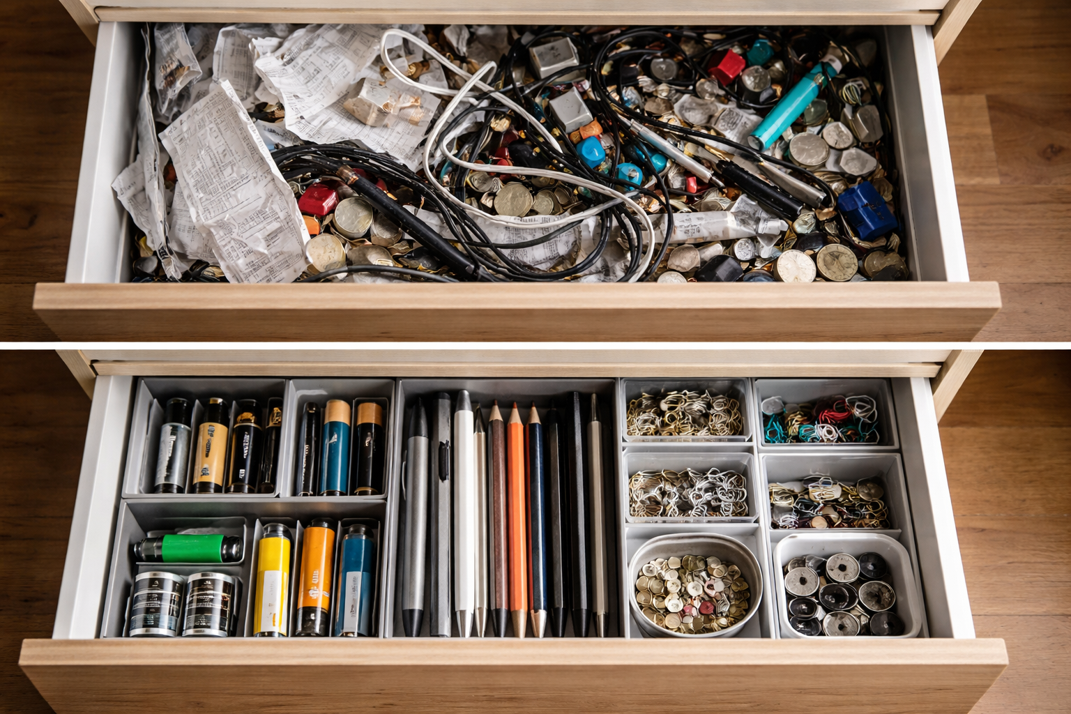 Οι επιταγές, οι παλιές μπαταρίες, οι συνδετήρες και τα κουμπιά που βρίσκονται διάσπαρτα στις επιφάνειες δημιουργούν ένα σοβαρό οπτικό θόρυβο. Αυτός ο παράγοντας επηρεάζει άμεσα το επίπεδο της εσωτερικής έντασης και μας εμποδίζει να ξεκουραστούμε πλήρως μετά από μια κουραστική ημέρα. Ο εγκέφαλός μας διαβάζει την αφθονία των μικρών αντικειμένων ως ανεκτέλεστες εργασίες, γεγονός που μας κάνει να αισθανόμαστε συνεχώς κουρασμένοι, ακόμη και στο ίδιο μας το σαλόνι.