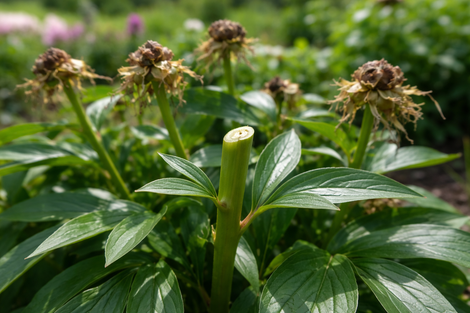 Πώς να αφαιρέσετε σωστά τις ανθισμένες κεφαλές – Ετοιμάστε ένα κοφτερό και καθαρό ψαλίδι κλαδέματος κήπου – Βρείτε το πρώτο μεγάλο υγιές φύλλο κάτω από το μαραμένο μπουμπούκι – Κάντε ένα ομοιόμορφο, λοξό κόψιμο λίγο πάνω από αυτό το φύλλο – Μαζέψτε όλα τα κομμένα μέρη και βγάλτε τα έξω από το παρτέρι.
