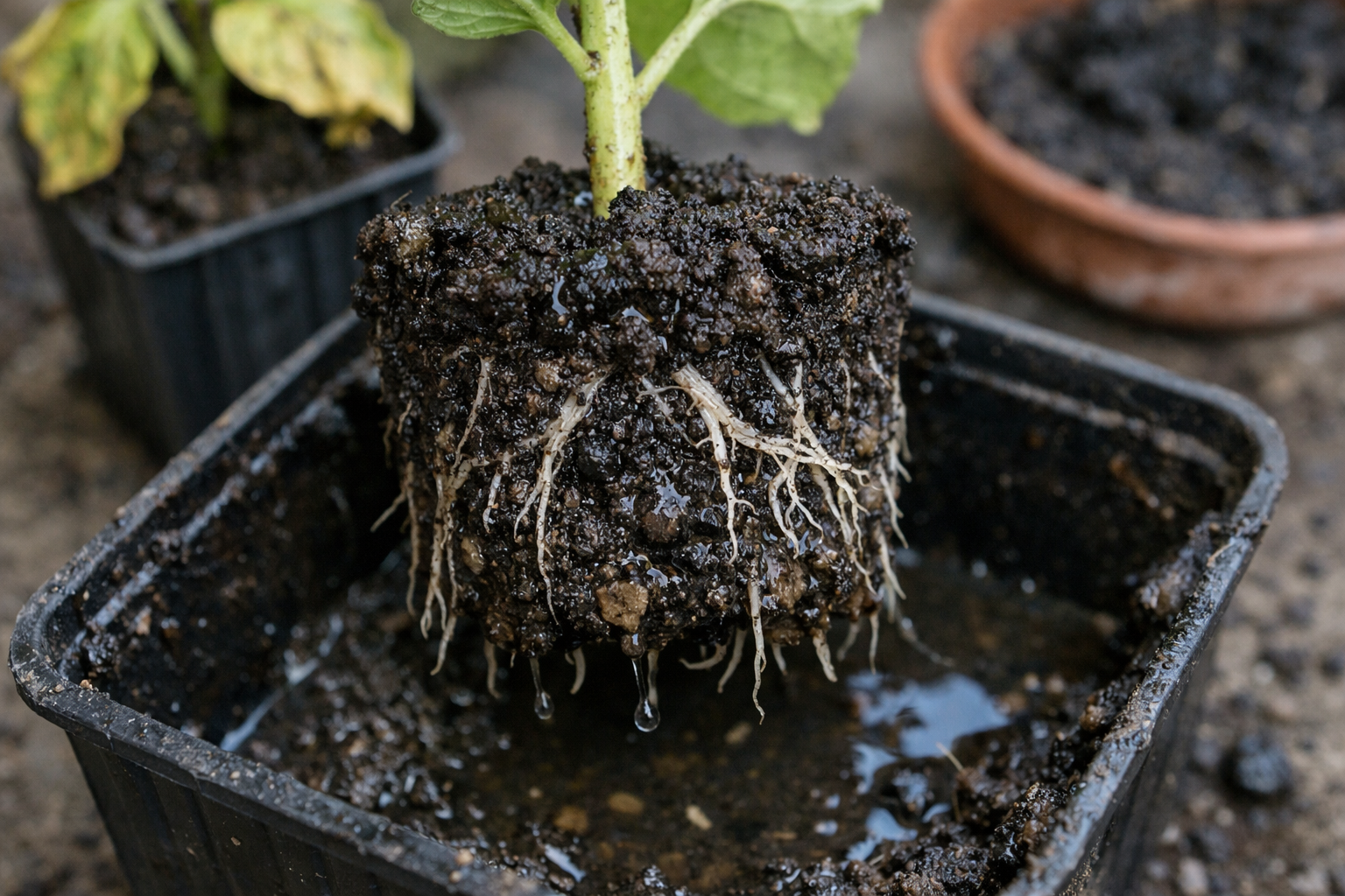 Το έδαφος παραμένει βαρύ και υγρό, αλλά το φυτό φαίνεται εντελώς αφυδατωμένο.