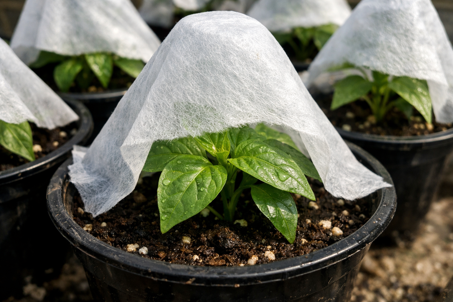 Λεπτό λευκό υλικό κάλυψης τεντωμένο μπροστά από τα δοχεία