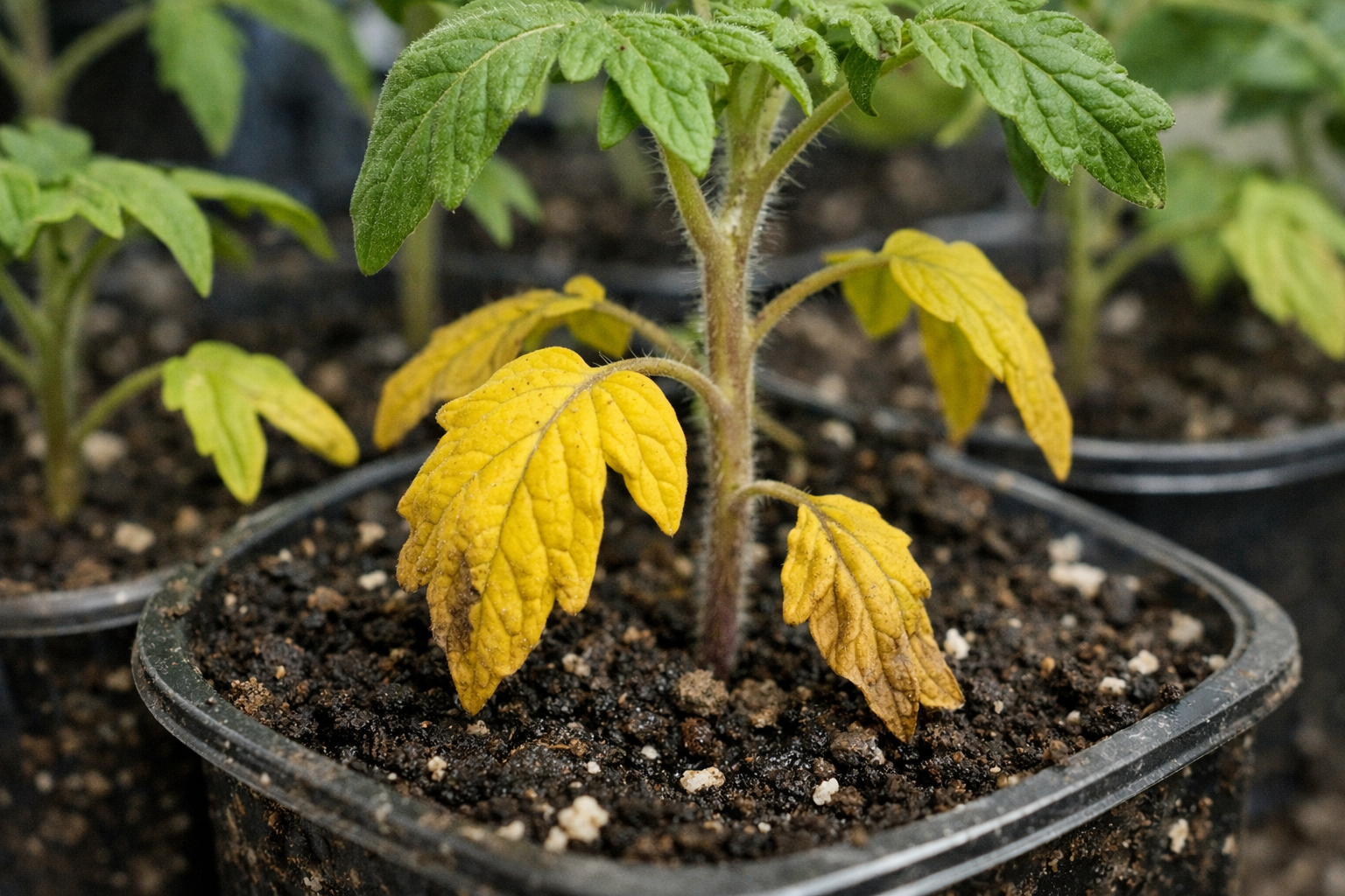 Μια μυστική απόχρωση: αν το κιτρίνισμα ξεκινά από τα χαμηλότερα φύλλα και η κορυφή είναι αφύσικα σκούρα πράσινη και κατσαρώνει προς τα μέσα, αυτό είναι 100% ένδειξη δηλητηρίασης από αμμωνία και όχι έλλειψη φωτός.