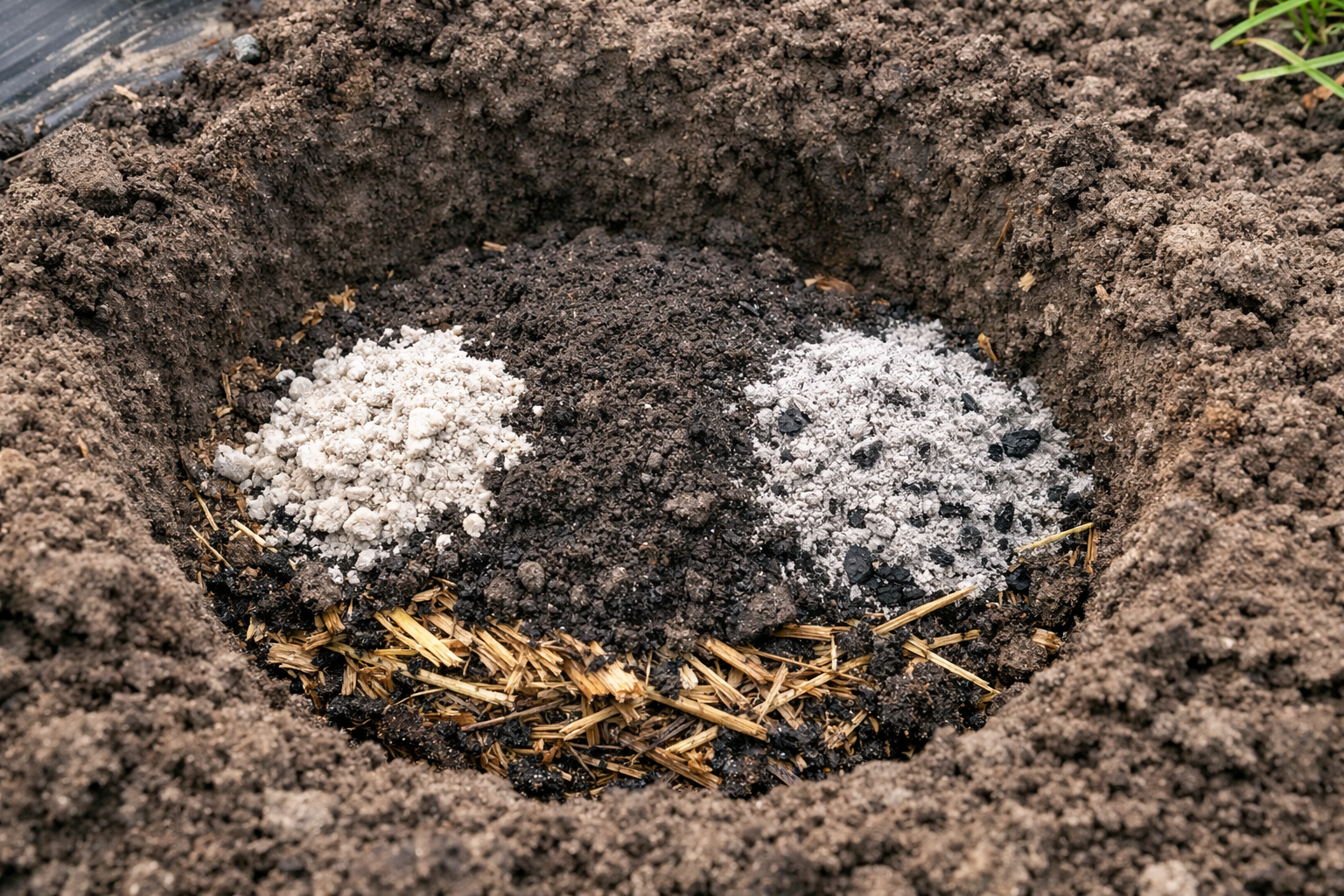 Για να δημιουργηθεί ένα θερμό μαξιλάρι στον πυθμένα της τρύπας τοποθετείται οργανική ύλη, η οποία, όταν χωνεύεται, εκπέμπει ήπια θερμότητα. Από πάνω πρέπει να χυθεί ένα στρώμα χώματος, για να μην καούν οι τρυφερές ρίζες των σπορόφυτων.