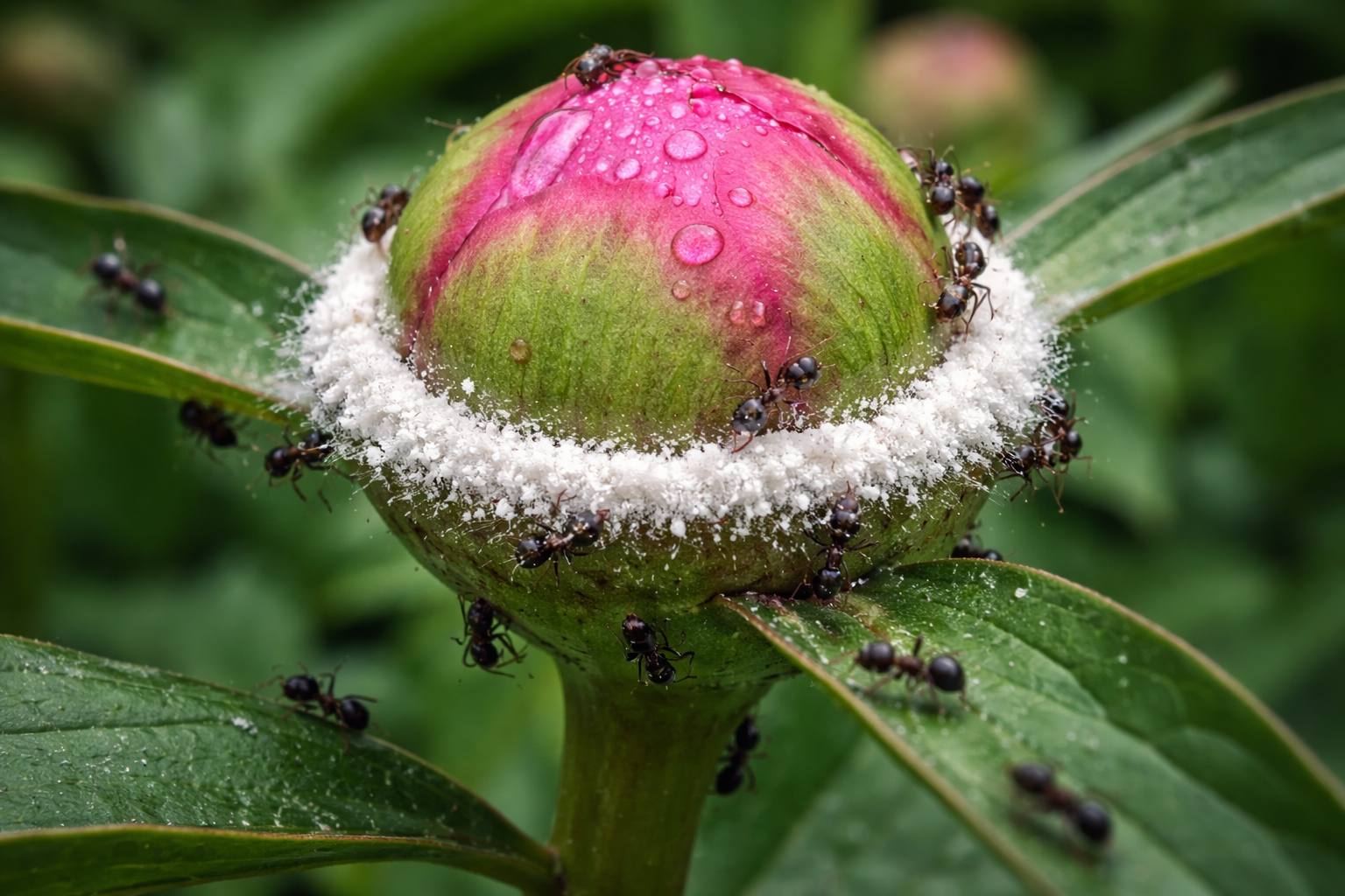 Τα μυρμήγκια δεν τρώνε τα πέταλα και τα φύλλα, έλκονται αποκλειστικά από το θρεπτικό σιρόπι, αλλά μπορεί να εισάγουν αφίδες ή να καταστρέψουν το ανώτερο στρώμα του μπουμπουκιού, προκαλώντας του παραμόρφωση.