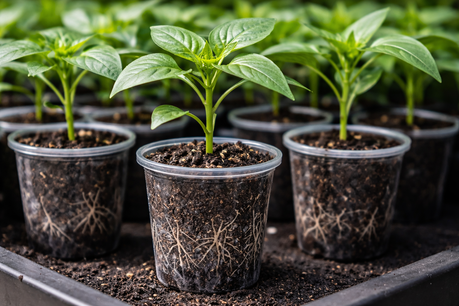 Τα σκουρόχρωμα δοχεία μπορούν να διατηρήσουν καλύτερα τη θερμότητα που χρειάζονται οι πιπεριές, ενώ τα διαφανή τοιχώματα επιτρέπουν στον παραγωγό να παρακολουθεί οπτικά την κατάσταση του ριζικού συστήματος.