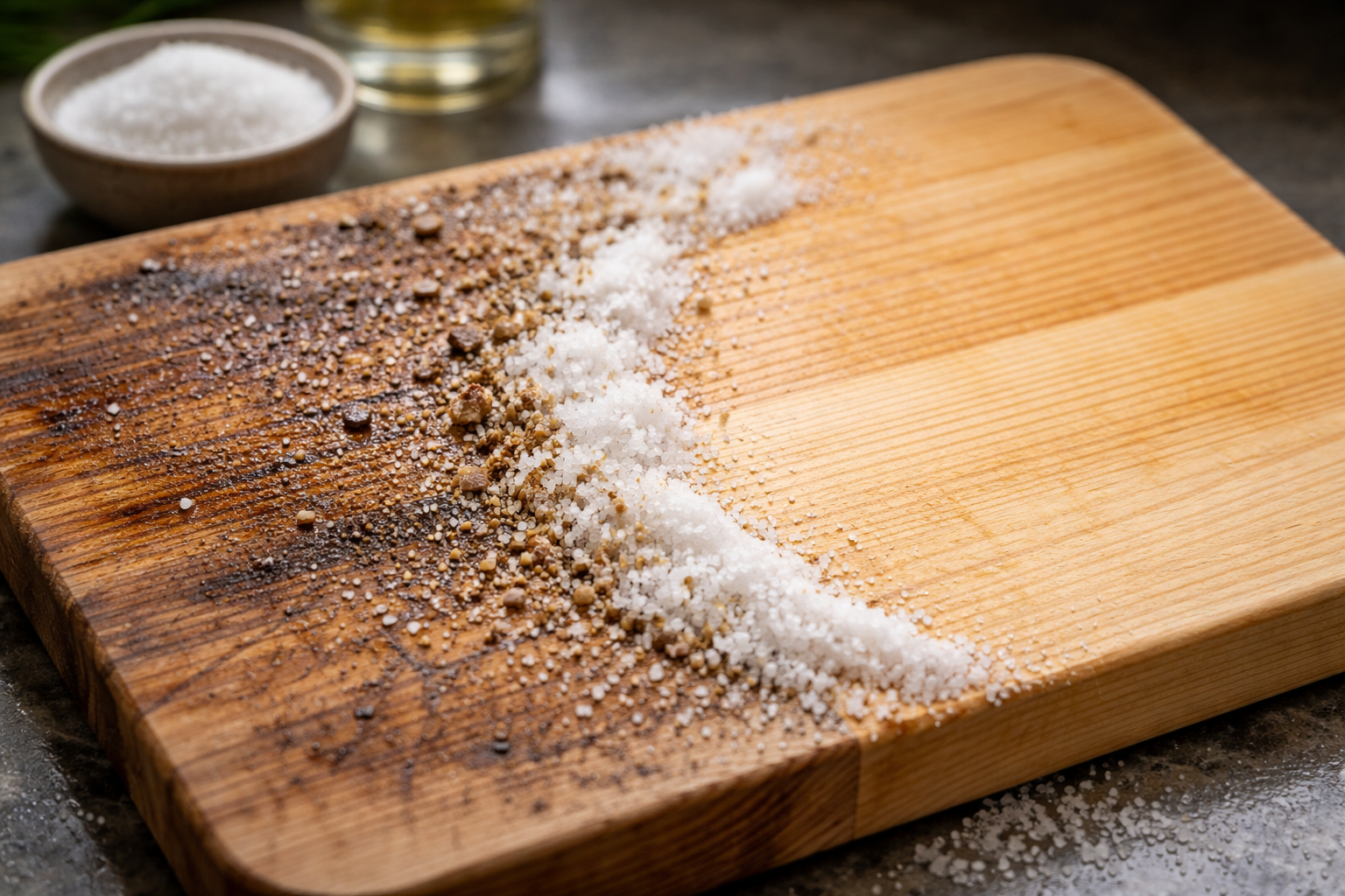 Το ξύλο έχει πορώδη δομή. Τα συνηθισμένα απορρυπαντικά απομακρύνουν μόνο το επιφανειακό λίπος, παγιδεύοντας τα μικρόβια και τους χυμούς από τα τρόφιμα βαθιά μέσα στις ίνες. Για να βγάλουμε τη βρωμιά έξω, θα χρειαστούμε φυσικά απορροφητικά και οξέα τροφίμων.