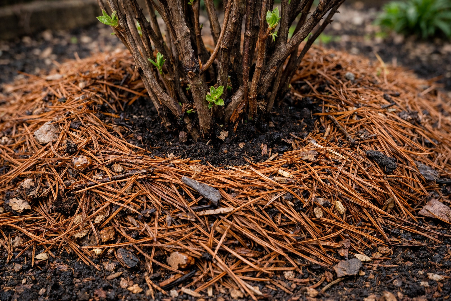 – Αρχικά, ποτίστε τους θάμνους άφθονα με καθαρό νερό – Απλώστε ένα στρώμα χούμου ή κομπόστ – Τοποθετήστε τις βελόνες ομοιόμορφα, μερικά εκατοστά μακριά από τον κορμό – Στερεώστε ελαφρά το μαξιλάρι με τα χέρια σας για να μην το παρασύρει ο άνεμος