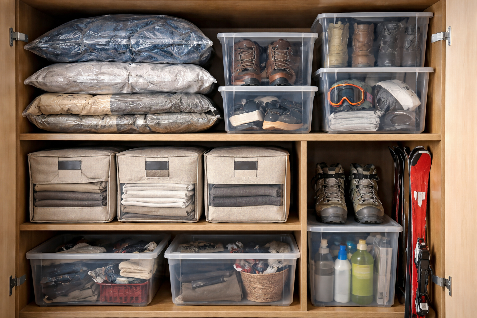 Ένα μεγάλο λάθος κατά την εκκαθάριση των μη εποχιακών αποθεμάτων σας είναι να προσπαθείτε να τα στριμώξετε όλα σε ένα μεγάλο κουτί. Πριν αποθηκεύσετε τα πράγματα, πρέπει να τα οργανώσετε σωστά. Σακούλες κενού и πλαστικά δοχεία εκπληρώνουν διαφορετικά καθήκοντα και δεν πρέπει να συγχέονται.