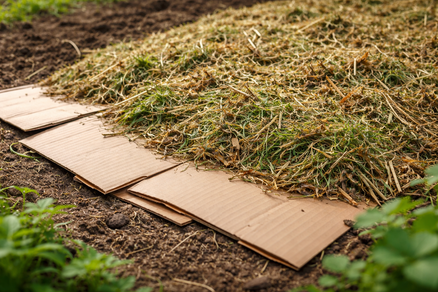 Τοποθετήστε φύλλα συνηθισμένου κυματοειδούς χαρτονιού χωρίς ταινία σφιχτά πάνω από την περιοχή με τα ζιζάνια.
