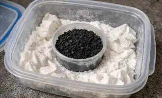 Πασπαλίστε ένα πυκνό στρώμα σφαιριδίων απευθείας πάνω στο πέτρινο ίζημα στα πλαστικά κελιά.