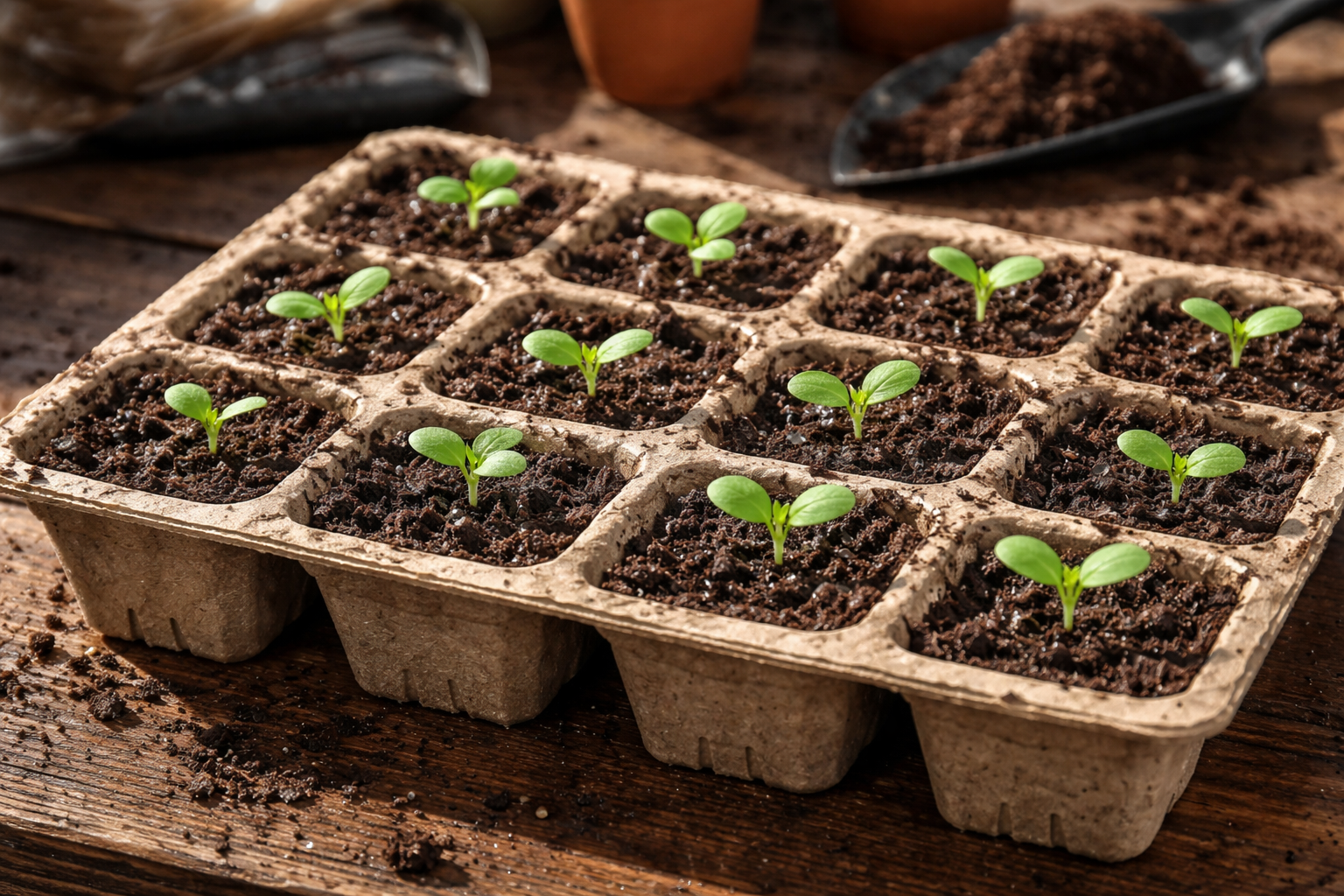 Κορυφαίο μυστικό: πριν φυτέψετε τους σπόρους, βρέξτε ελαφρά τον πυθμένα των κελιών με ζεστό νερό από ψεκαστήρα για να επιταχύνετε την αποσύνθεση του χαρτονιού μετά τη φύτευση στο ανοιχτό έδαφος.
