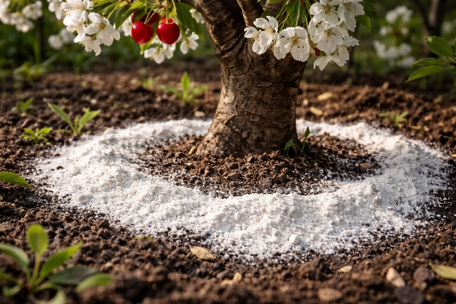 Οι κερασιές συχνά ρίχνουν τις ωοθήκες τους ή παράγουν μικρά, ξινά μούρα λόγω της λανθάνουσας οξίνισης του εδάφους γύρω από τις ρίζες. Το πρόβλημα αυτό λύνεται εύκολα με μια ανοιξιάτικη εφαρμογή του κατάλληλου φυσικού οξυζενέ, το οποίο αποκαθιστά αμέσως την ισορροπία και θρέφει το δέντρο με απαραίτητα μέταλλα.