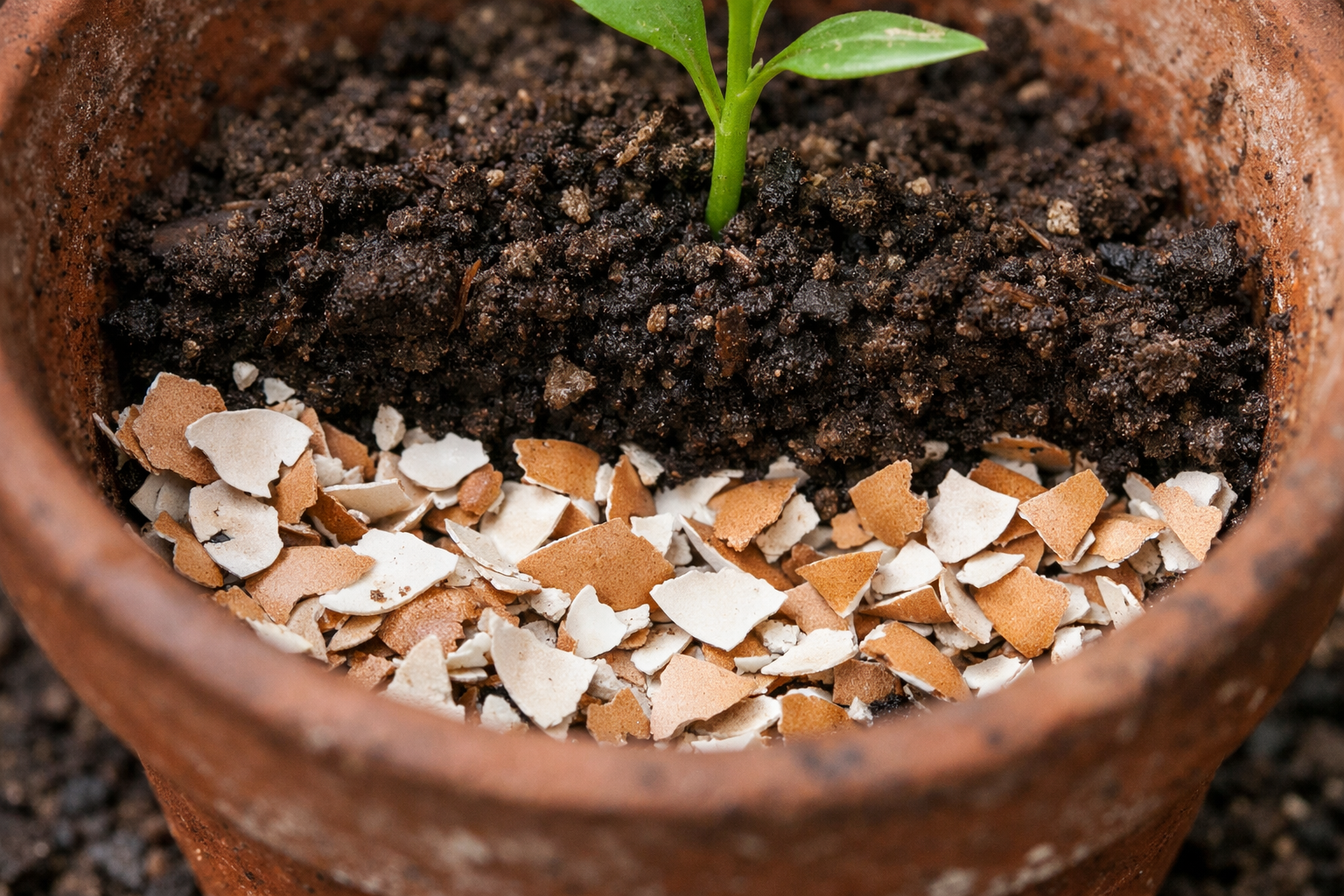 “Η μυστική απόχρωση: για να λειτουργήσουν τα τσόφλια ως αποστραγγιστικά και όχι απλώς αναμεμειγμένα με το χώμα, μην τα θρυμματίζετε πολύ ψιλά. Αρκεί να συνθλίψετε ελαφρά ένα ολόκληρο αυγό με την παλάμη του χεριού σας για να πάρετε θραύσματα μεγέθους ενός ή δύο εκατοστών”.