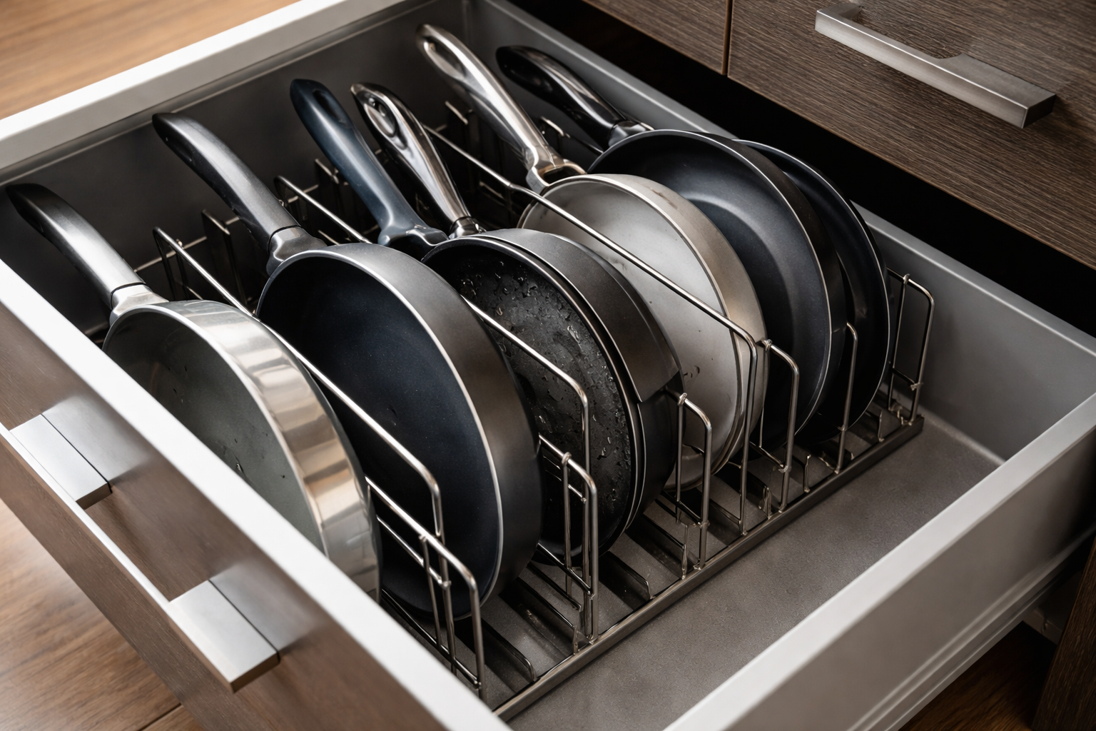 Για όσους προτιμούν να αποθηκεύουν τα πιατικά τους σε βαθιά συρτάρια, τα ειδικά συρτάρια είναι ιδανικά. διαχωριστικά. Σας επιτρέπουν να τοποθετείτε τα τηγάνια στις άκρες τους όπως τα βιβλία σε ένα ράφι. Αυτό όχι μόνο απελευθερώνει χώρο, αλλά σας επιτρέπει επίσης να φτάσετε το αντικείμενο που χρειάζεστε με μία κίνηση χωρίς να χρειάζεται να αναδιατάξετε τα υπόλοιπα.
