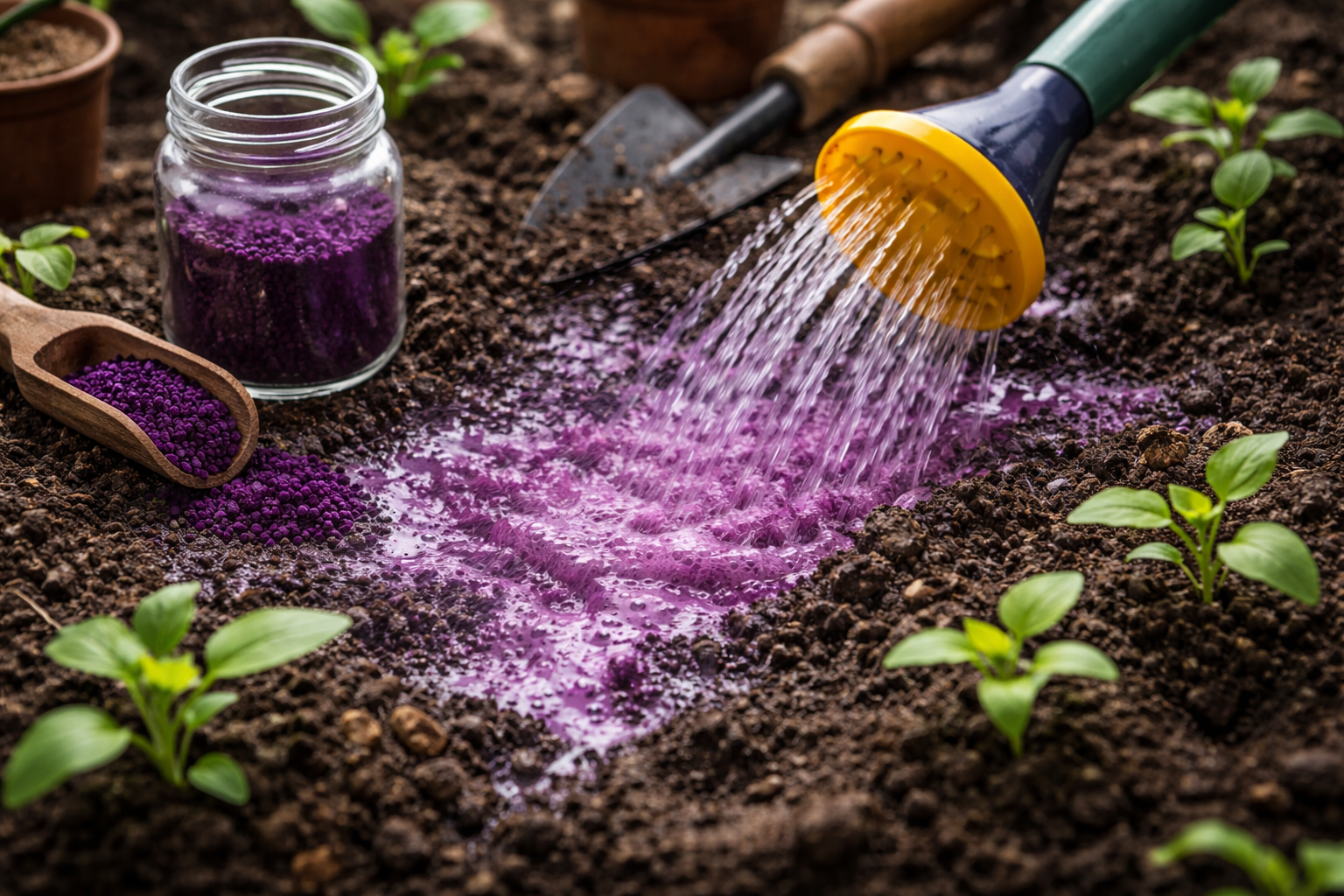 Μυστική απόχρωση από την προσωπική πρακτική: Ποτέ μην διαλύετε τους κρυστάλλους απευθείας στο ποτιστήρι του κήπου. Φτιάξτε πρώτα ένα συμπυκνωμένο μητρικό υγρό πλούσιου σκούρου χρώματος σε ένα μικρό γυάλινο βάζο, ανακατέψτε καλά όλους τους κόκκους και στη συνέχεια προσθέστε το σταγόνα-σταγόνα σε έναν κουβά με νερό για πότισμα, ώστε να μην καούν οι ευαίσθητες ρίζες των φυτών.