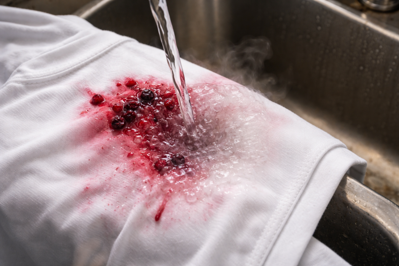 Απαγορεύεται αυστηρά να τρίβετε τη φρέσκια βρωμιά με χαρτοπετσέτα ή σκληρό σφουγγάρι, καθώς έτσι απλώς θα τρίψετε τον χυμό βαθύτερα στη δομή του υλικού.